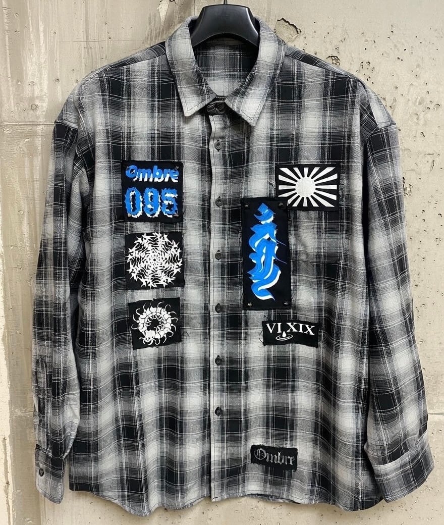 Ombreオリジナルパッチワークとスタッズ加工を施したチェックシャツ、背面には大きく八咫烏をシルクスクリーンでプリント。一点一点パッチワークの配置やデザインが異なります。